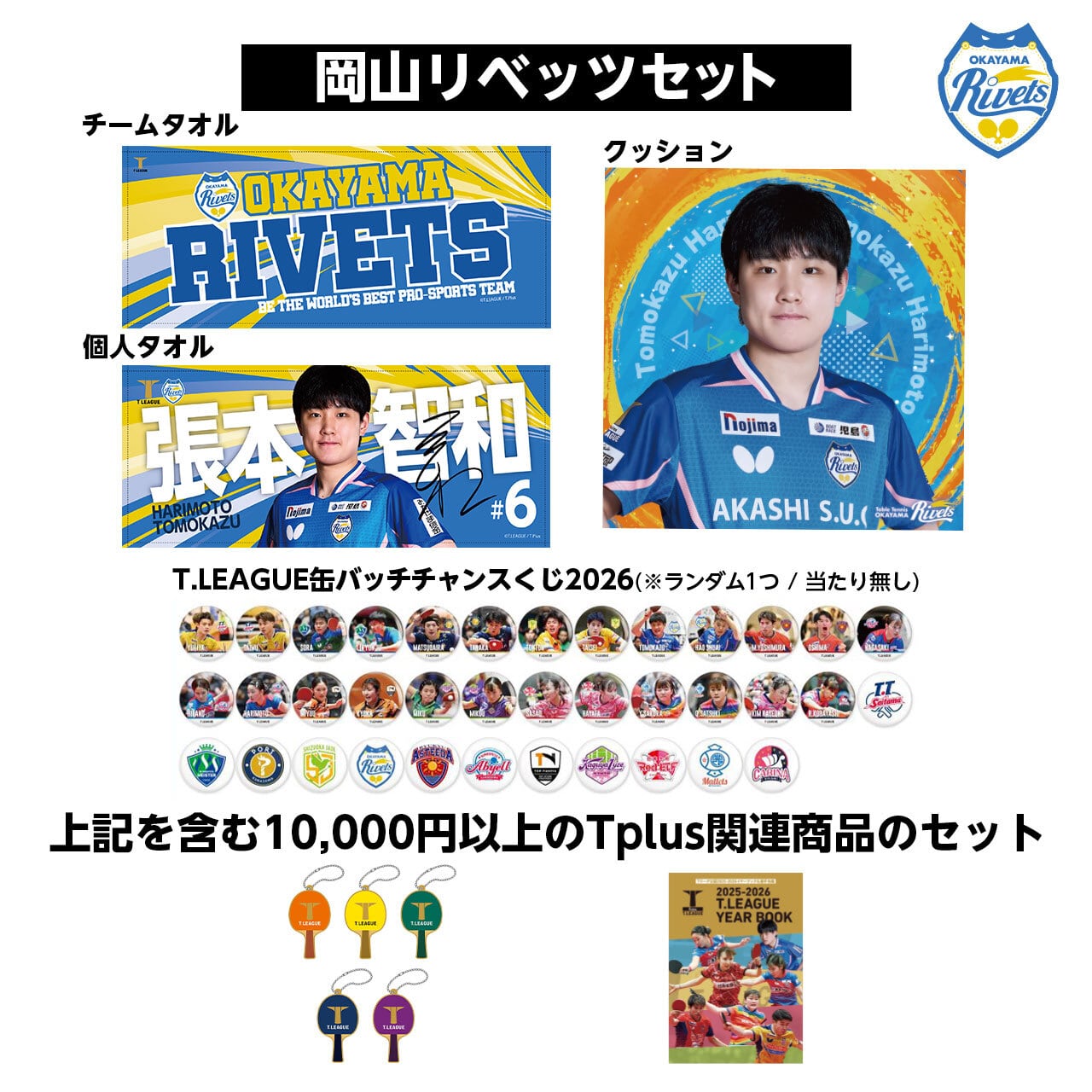 チーム応援フェイスタオルに加え、プレイヤーズ応援フェイスタオル(張本智和)と、同選手のクッションをセットにした豪華な内容です。